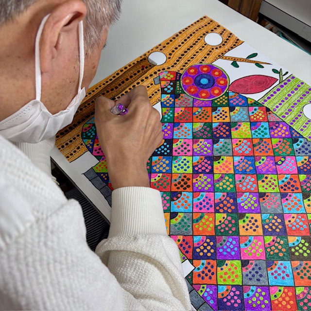 アート部門では絵画や手芸など専門の先生による講座を開催しながら創作活動をおこなっているほか、シール貼り作業や封入封緘作業などの内職作業を常時しています。
